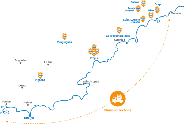 Fréjus est le centre névralgique de notre dispositif. C’est depuis Fréjus, au sein de nos quatre Eco-Pôle Recyclage que l’ensemble des matières du territoire est préparé afin de partir vers les filières de valorisation. Ce dispositif opérationnel est complété par des centres externes que nous appelons Eco-Relais. Implantés sur le Var et les Alpes-Maritimes, ils vous permettent de bénéficier d’un panel de services au plus proche de vos gisements de déchets et donc de vos besoins.