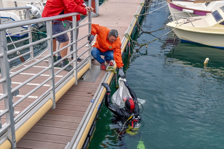 Nettoyage de printemps ce dimanche pour le Vieux-Port de Saint-Raphaël où une vingtaine de personnes, la plupart bénévoles, ont bravé le vent et le froid pour la bonne cause. Trois bonnes heures de ramassage en eau peu profonde pour les adhérents de l’association « Aquapassion » et du club de plongée « Aventure sous-marine », à l’initiative de ce projet Port sans déchet (première édition), de la Société Nationale du Sauvetage en Mer (SNSM) et des personnels de la Régie des ports. Afin de récolter ces indésirables, le groupe SCLAVO avait mis à disposition des « plongeurs-nettoyeurs » une benne de 8 m3. Seulement 2 m3 ont été nécessaires, le fond du bassin du Vieux-Port étant relativement propre. Une bonne nouvelle selon les responsables de la Régie, surtout pour une structure portuaire située en centre-ville.